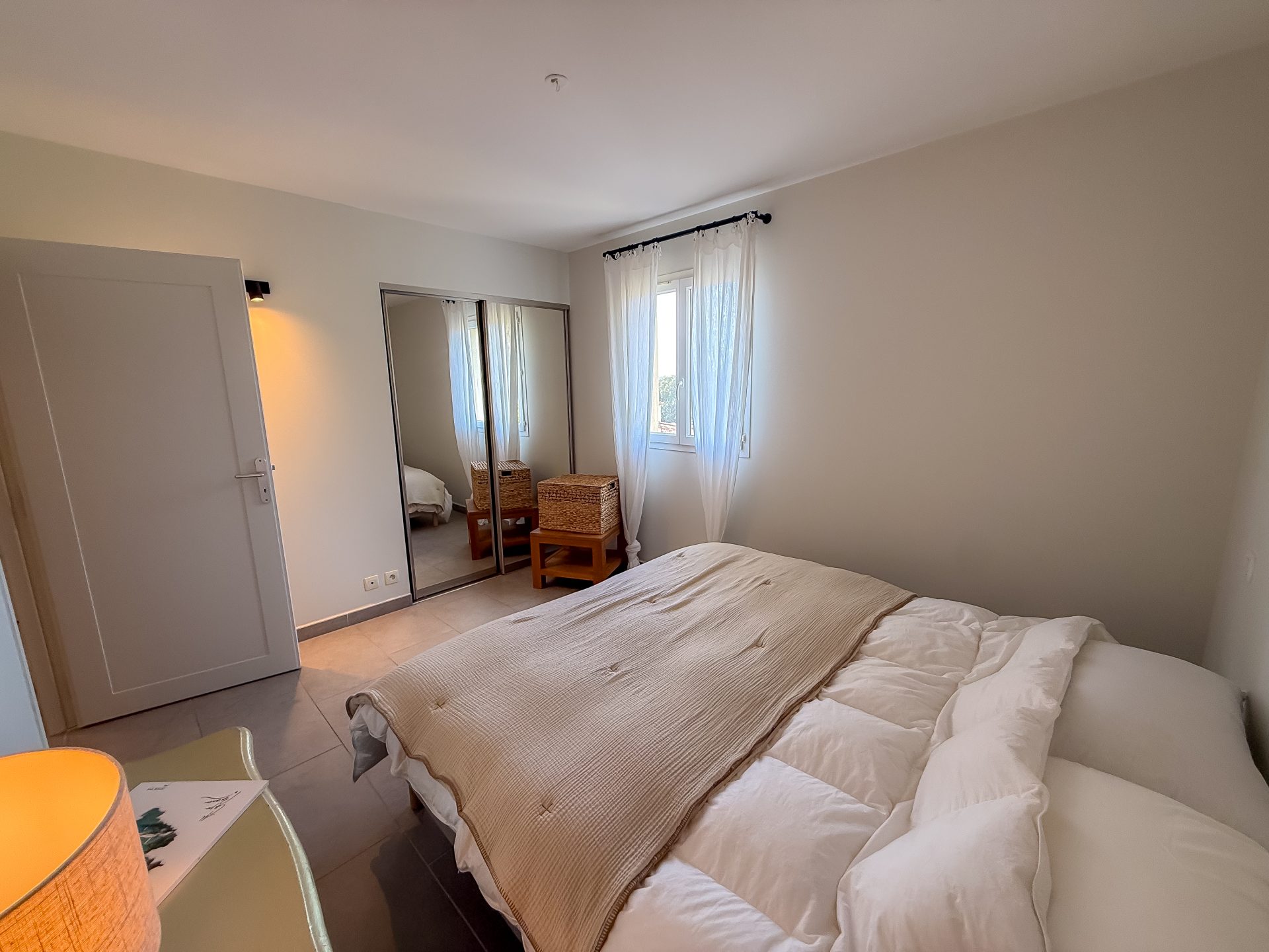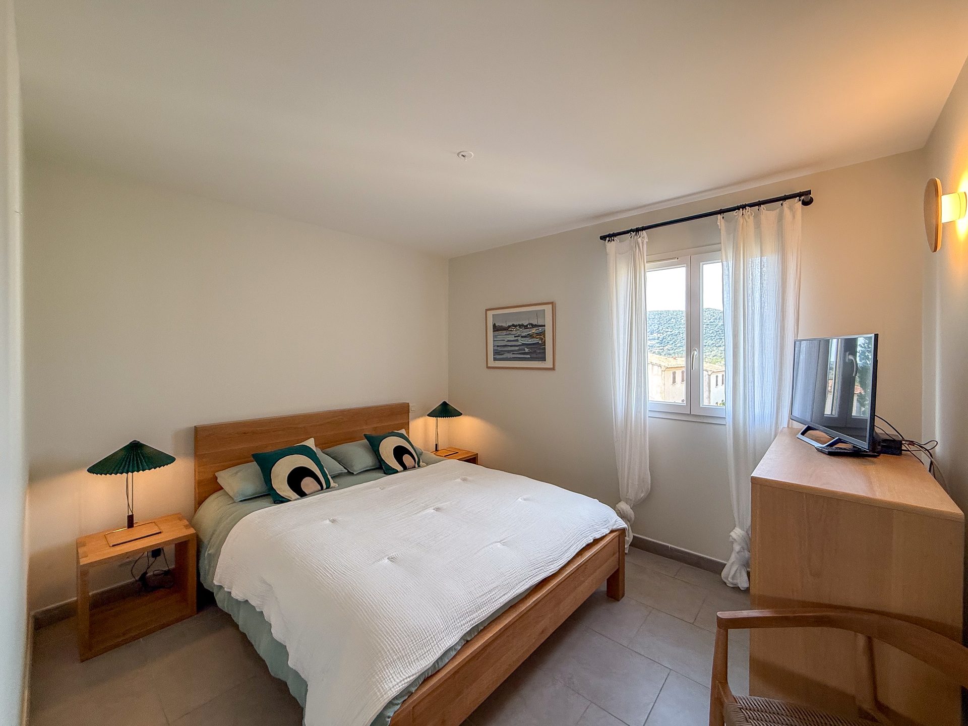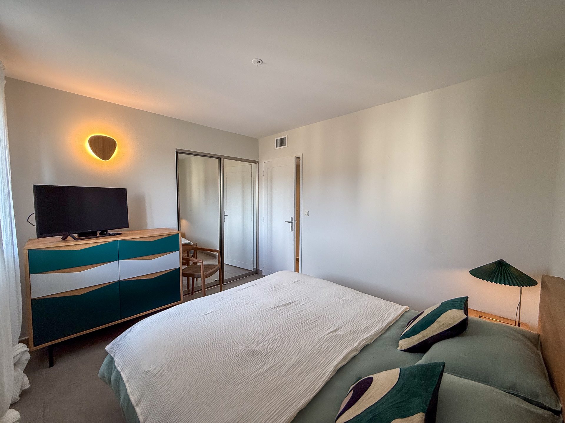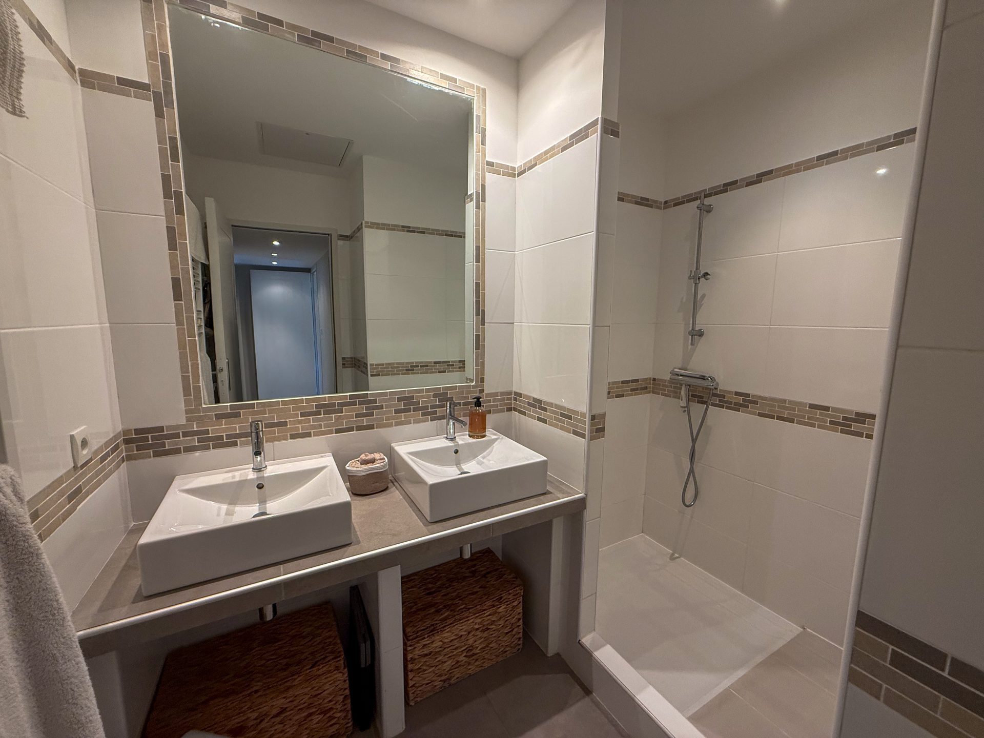 L’espace nuit comprend deux chambres avec placards aménagés, une salle d’eau moderne avec double vasque, douche et sèche-serviettes, ainsi que des toilettes indépendantes.