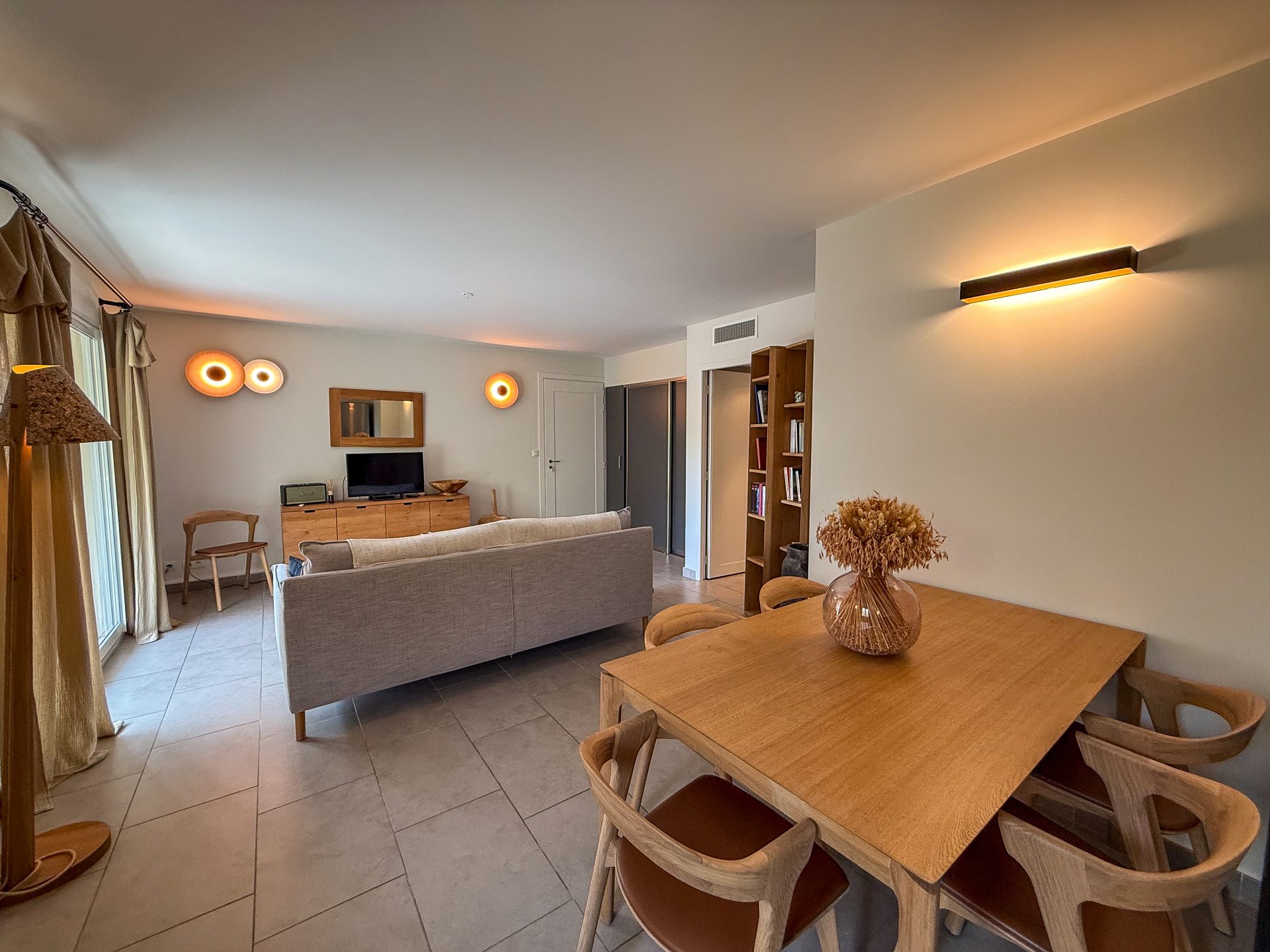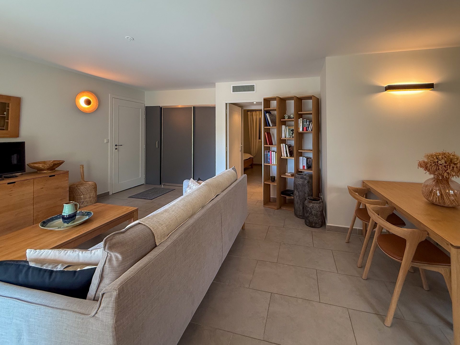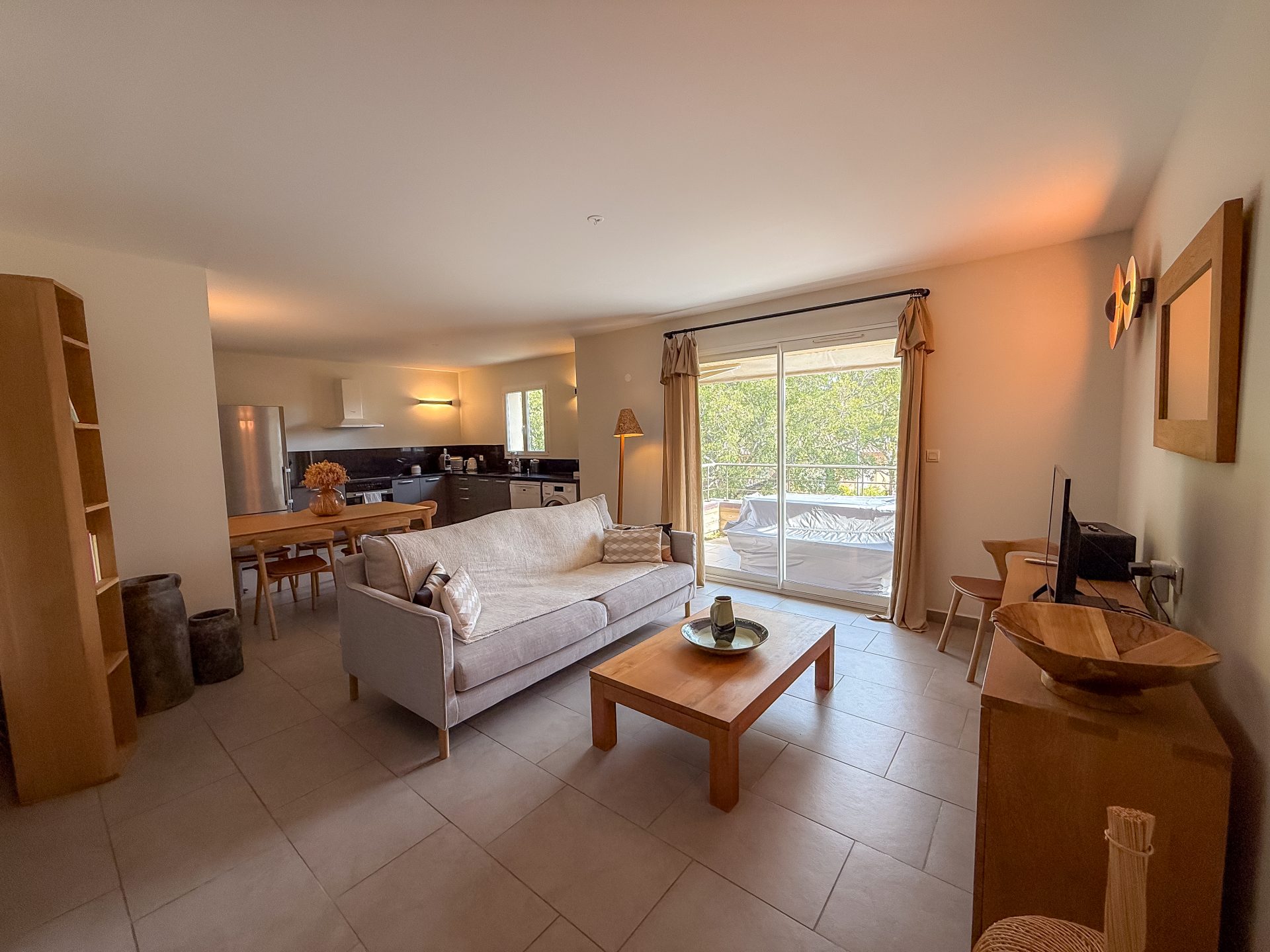 L’appartement, joliment décoré, se compose d’un séjour lumineux avec espace salon et coin repas, prolongé par une cuisine ouverte entièrement équipée. L’ensemble s’ouvre sur une agréable terrasse partiellement couverte, idéale pour profiter de la vue sur la mer et la tour de Pinarello.
